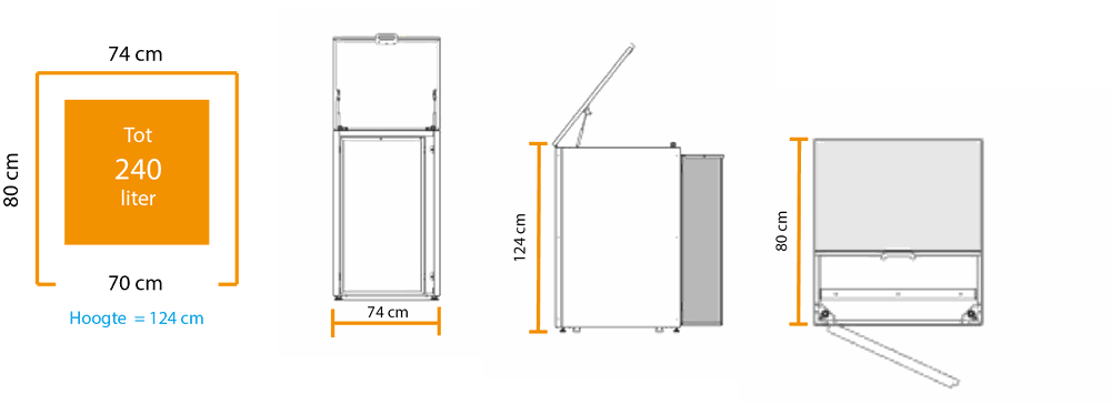 Uw container kan u er makkelijk in en uithalen en iedere kliko heeft een aparte compartiment zodat het volledig afgesloten is. In onze kliko-ombouw past een maximale grote container van 240 liter in. Meet uw container thuis op, de maten van de kliko kunnen verschillen per gemeente.