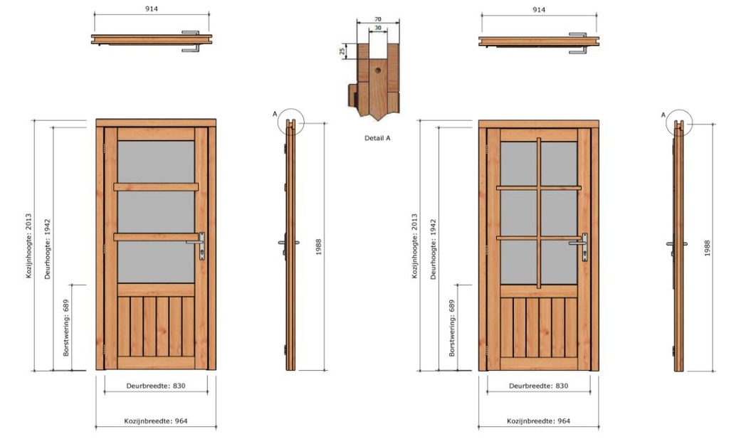 Enkele- of dubbele deur uitvoering van de glasdeur: Enkele deur (deur 830x1942mm + kozijn 964x2013mm) of Dubbele deur (deur 2x830x1942mm + kozijn 1796x2013mm)
